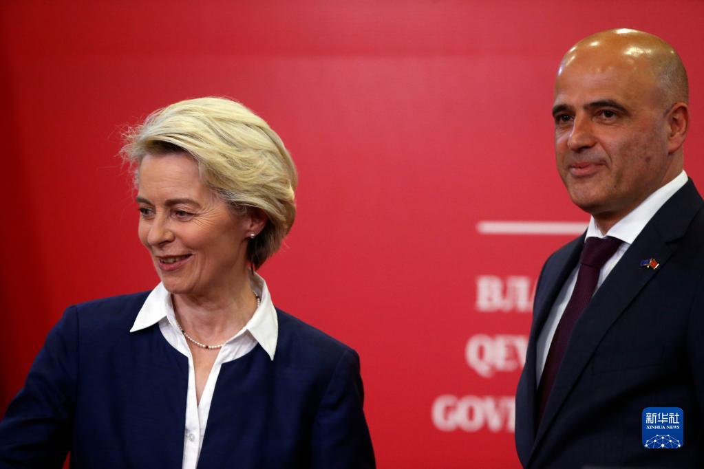 10月26日,在北馬其頓斯科普里,歐盟委員會主席馮德萊恩(左)在與北馬其頓總理科瓦切夫斯基舉行的聯合新聞發布會上講話。