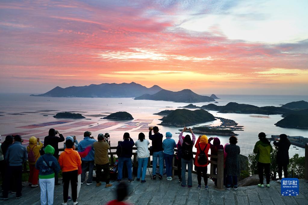 游客在福建省霞浦縣三沙鎮花竹村海邊拍攝海上養殖區日出景觀(10月26日攝)。