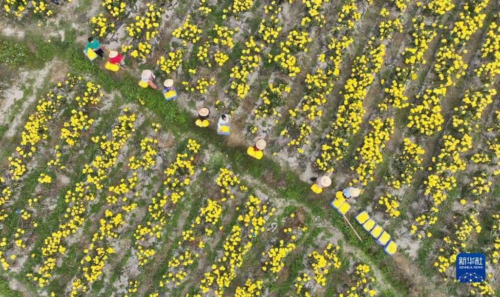 近日,湖南省衡陽市南岳區壽岳鄉岳林村種植的高山皇菊進入采收期,村民搶抓晴好天氣采摘菊花、加工菊花茶。當地依托高山林地特點,發展高山皇菊種植產業,推動農旅融合,助力鄉村振興。