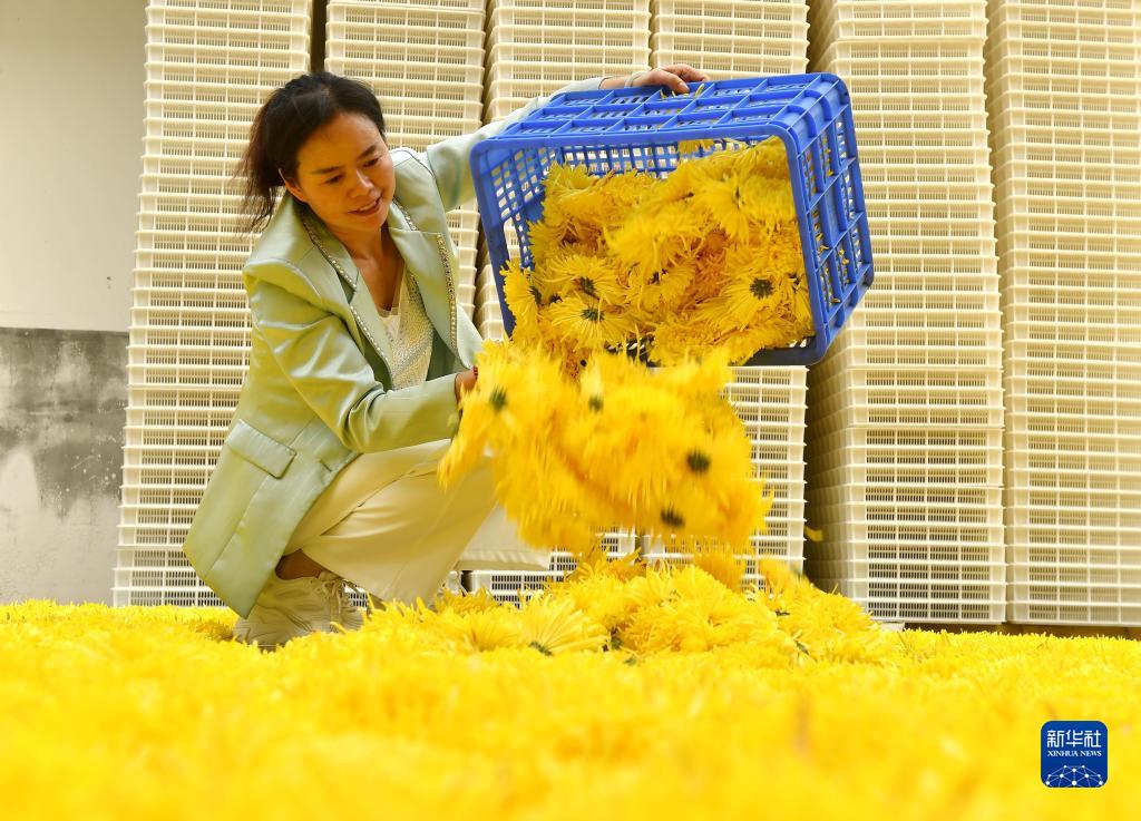 近日,湖南省衡陽市南岳區壽岳鄉岳林村種植的高山皇菊進入采收期,村民搶抓晴好天氣采摘菊花、加工菊花茶。當地依托高山林地特點,發展高山皇菊種植產業,推動農旅融合,助力鄉村振興。