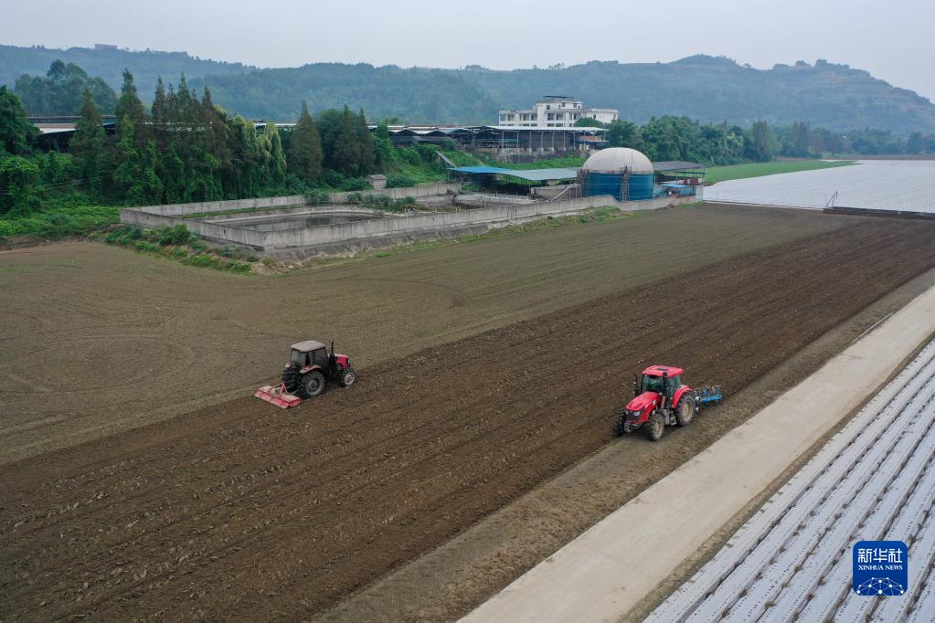 在重慶市合川區太和鎮米市村的蘿卜種植基地,種植戶在駕駛農用機械犁地(2022年10月13日攝,無人機照片)。當地養殖戶按照標準直接將糞污處理后轉化為有機肥,提供給種植戶。