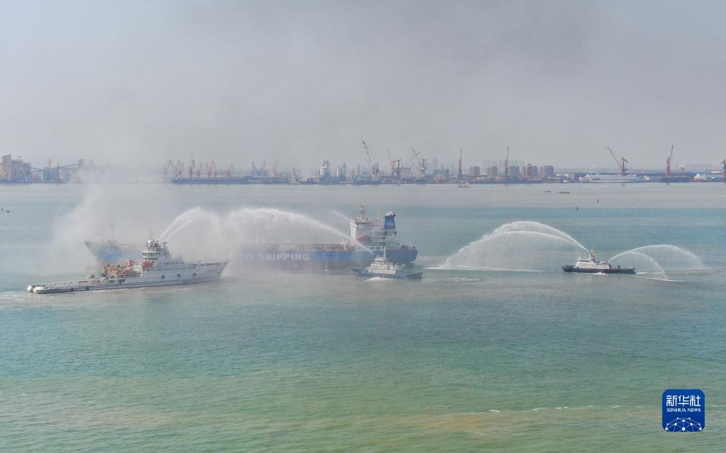 10月27日,參演搜救船只噴水滅火(無人機照片)。