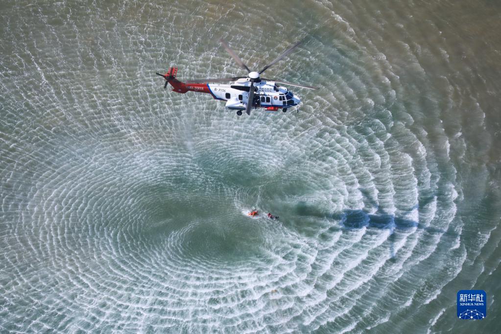 10月27日,直升機在演練海域搜救落水者(無人機照片)。