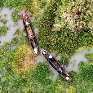 當日,浙江省湖州市吳興區水利部門組織作業人員對東林鎮東方村尚田港600畝水域的水葫蘆等入侵水生植物進行打撈清運,打撈水葫蘆近千噸。