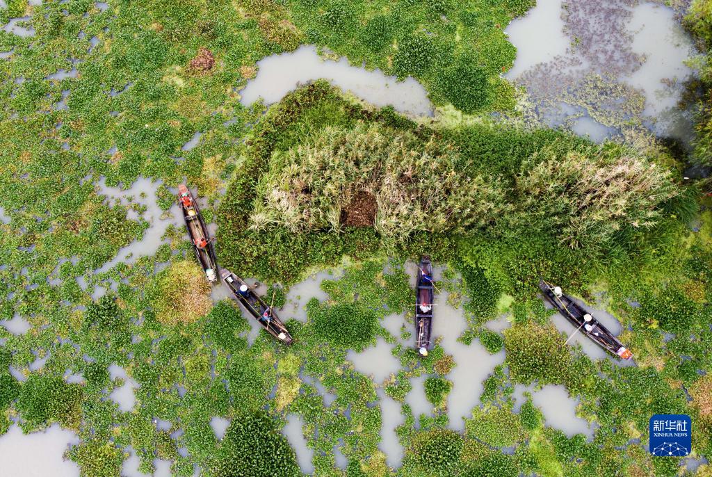 當日,浙江省湖州市吳興區水利部門組織作業人員對東林鎮東方村尚田港600畝水域的水葫蘆等入侵水生植物進行打撈清運,打撈水葫蘆近千噸。