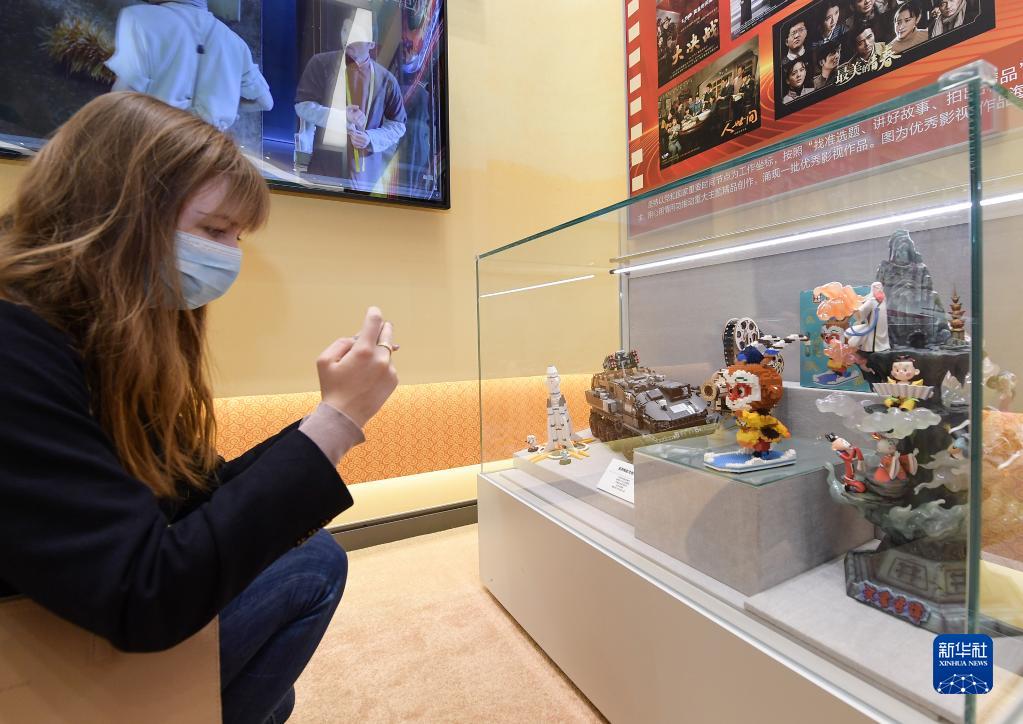 10月27日,外國嘉賓在參觀“奮進新時代”主題成就展時拍攝展柜內的卡通玩具。新華社記者 李賀 攝