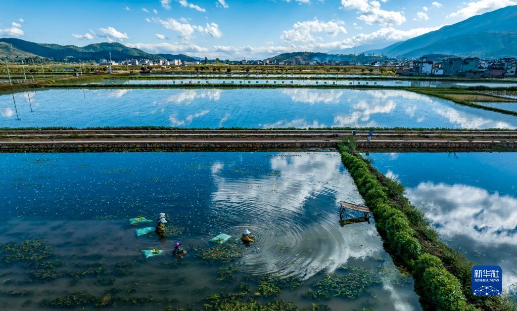 農戶在云南省大理白族自治州洱源縣右所鎮松曲村海菜田內忙碌(10月27日攝,無人機照片)。