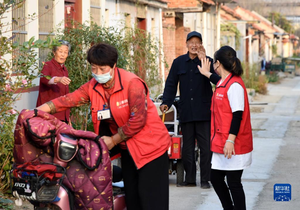 10月27日,在青島西海岸新區泊里鎮蟠龍李村,村民送別上門服務的養老服務中心工作人員。
