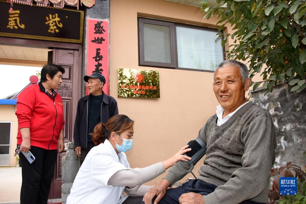 10月26日,在青島萊西市院上鎮武備三村居家養老服務站,工作人員為老人提供健康監測服務。