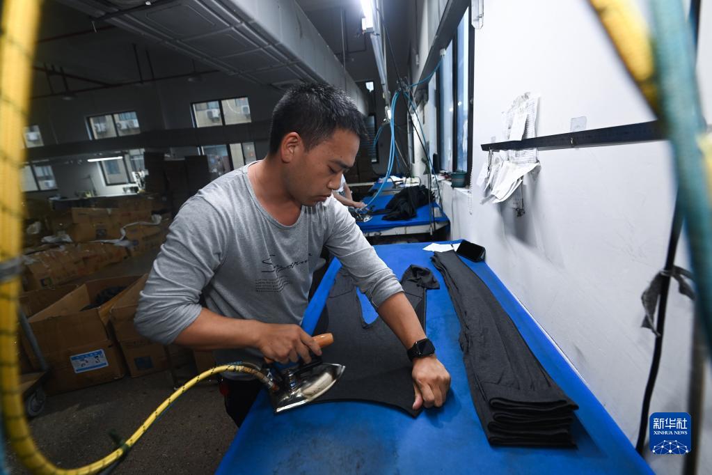 10月27日,在浙江省諸暨市大唐街道的一家企業車間內,工人在熨燙保暖褲襪。