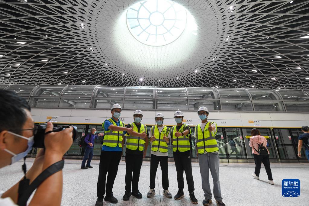 10月28日,參與崗廈北樞紐施工的中國中鐵建設者試乘地鐵14號線前在崗廈北樞紐“深圳之眼”拍照留念。