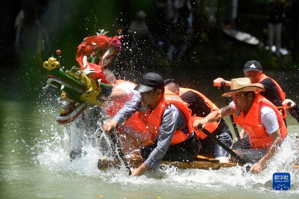 龍舟隊員在西溪濕地舉行的蔣村龍舟勝會上劃龍舟(2018年6月18日攝)。