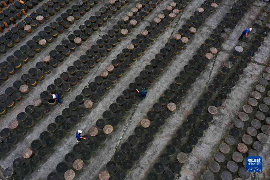 10月28日,在貴州省赤水市黔老翁醋廠,工人在晾曬區作業(無人機照片)。