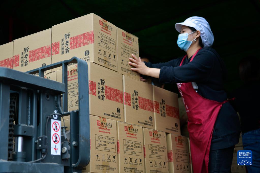 10月28日,在貴州省赤水市黔老翁醋廠,工人搬運成品醋裝車,準備外運銷售。