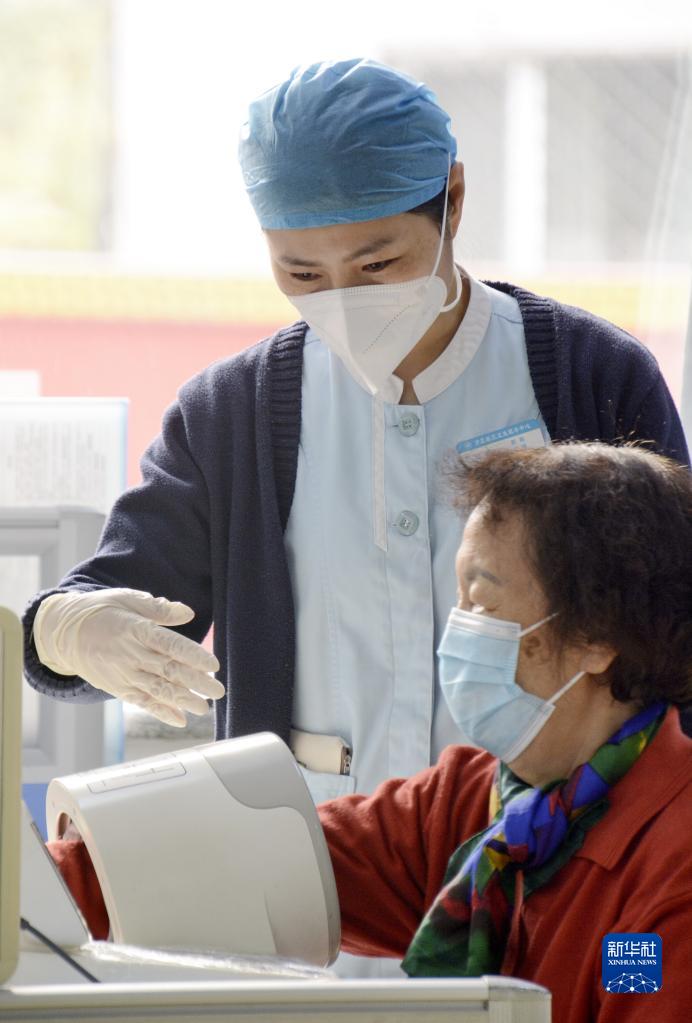 北京市豐臺區方莊社區衛生服務中心的醫護人員在協助一名老人測量血壓(10月26日攝)。
