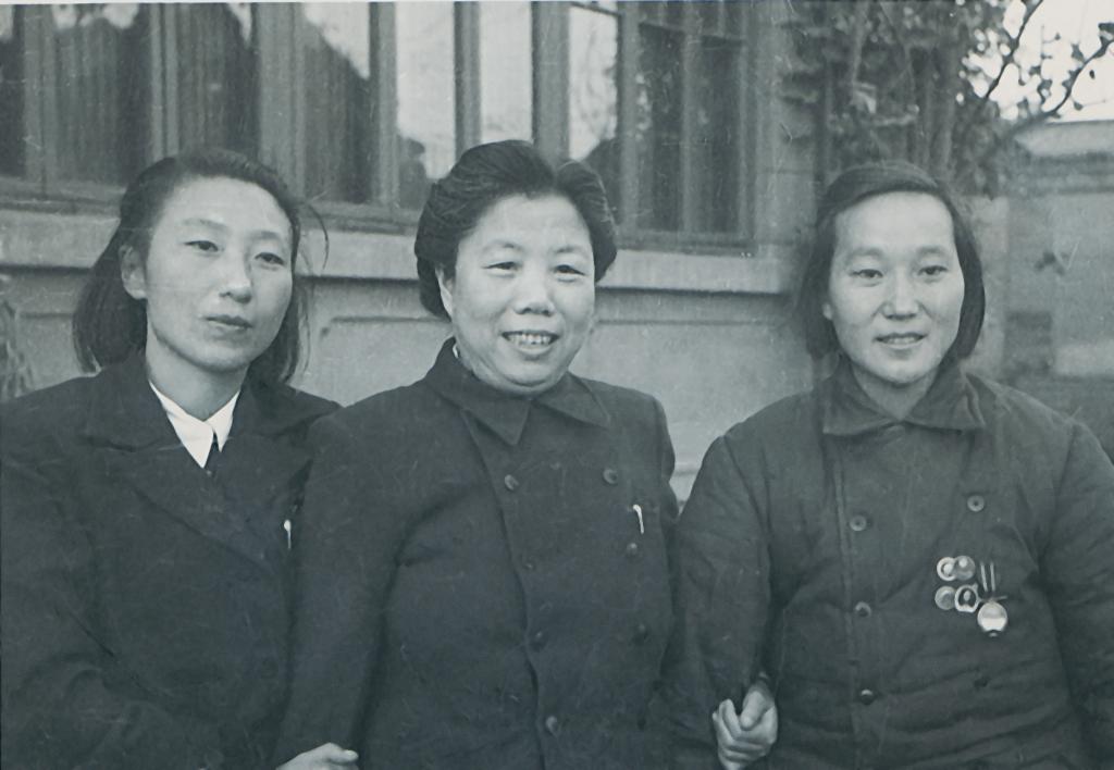 1951年,錢正英同志(左)和治淮勞模在全國婦聯招待會上與鄧穎超同志在一起。