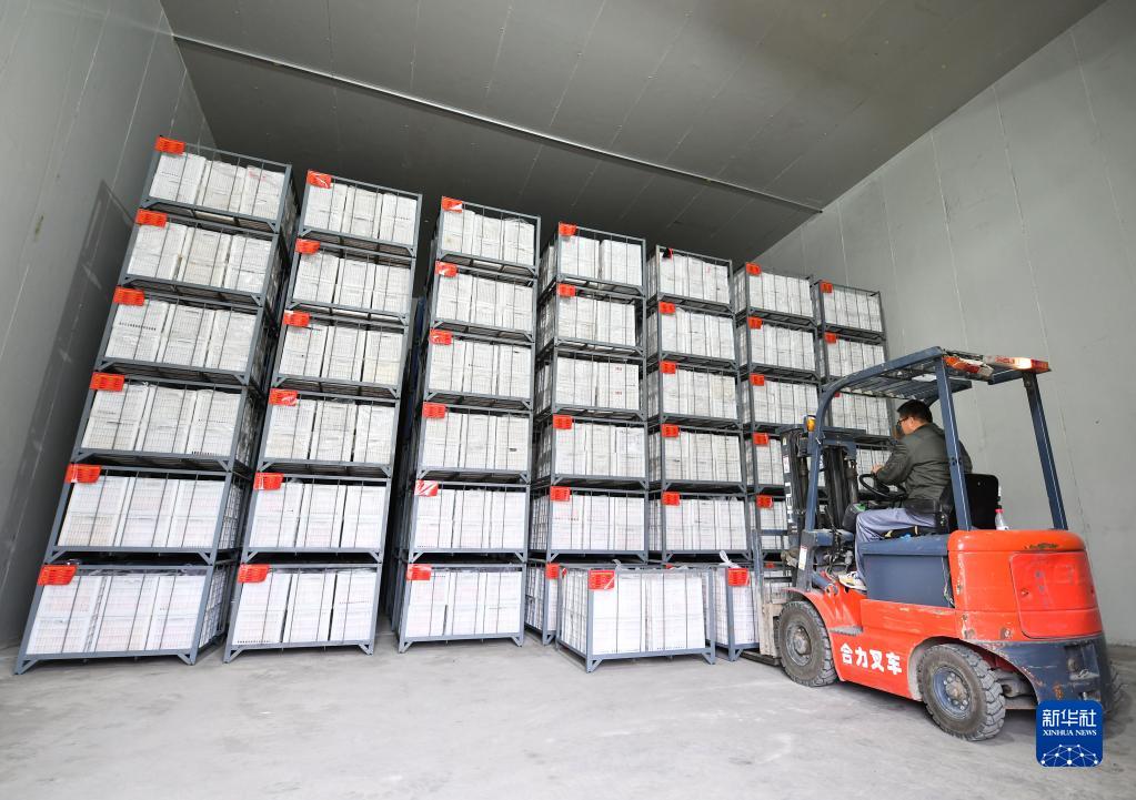 10月27日,在陜西省延安市安塞區南溝村,工作人員在冷庫搬運蘋果。 新華社記者 張博文 攝