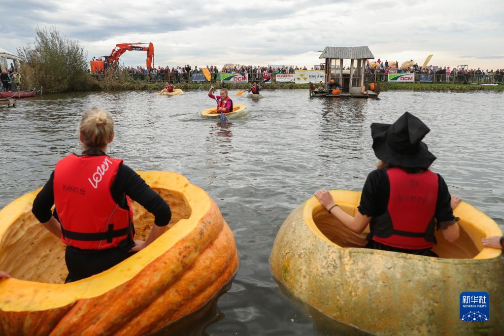 10月23日,人們在比利時卡斯特萊市利赫塔爾特村參加劃南瓜船比賽。