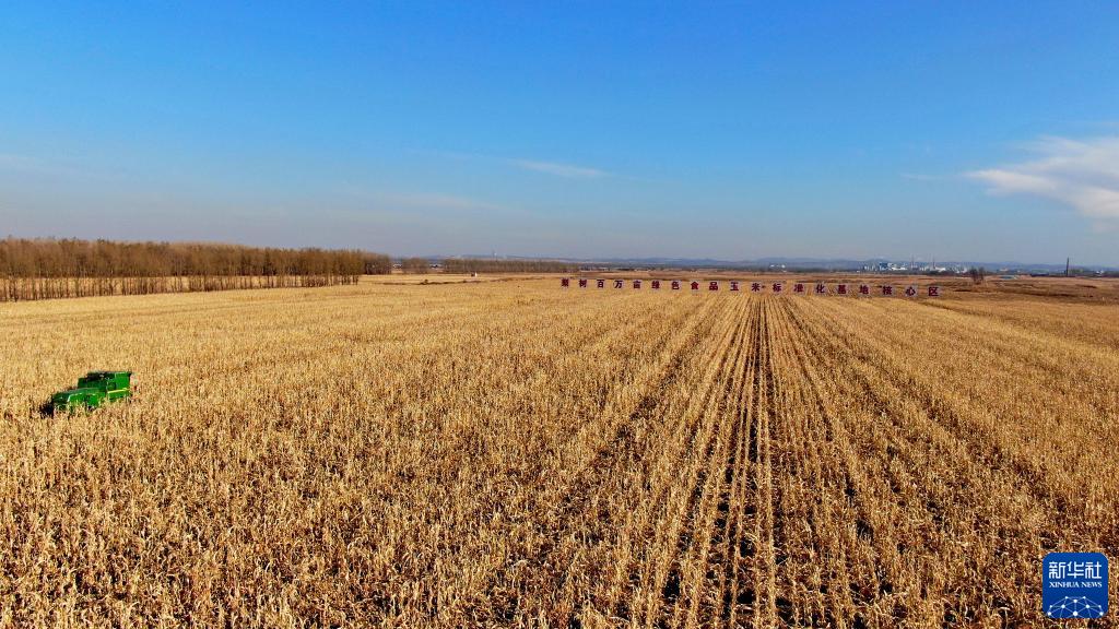 在吉林省四平市梨樹縣國家百萬畝綠色食品原料(玉米)標準化生產基地核心示范區,農民駕駛農機進行秋收作業(10月28日攝,無人機照片)。