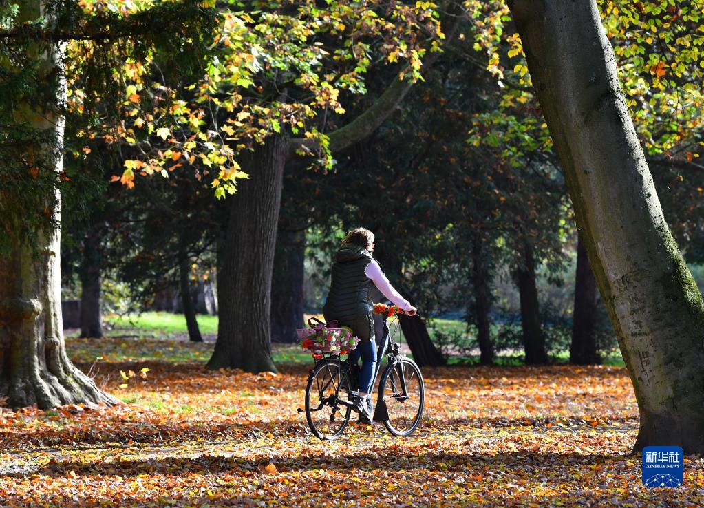 10月28日,在德國首都柏林,一名女子在樹林內騎行。