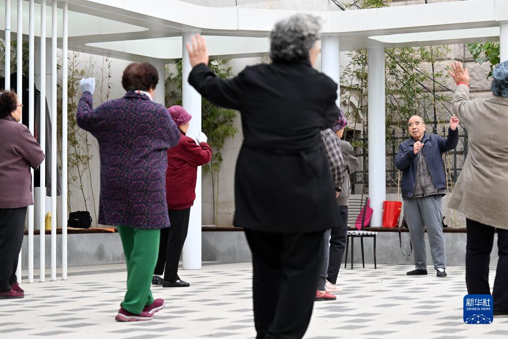 在天津市和平區文化村社區,老年人在適老化改造中新建的小區廣場上跳舞(10月28日攝)。