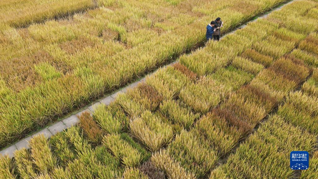 10月27日,在中科院合肥研究院智能所離子束生物工程與綠色農業研究中心的育種基地里,研究員劉斌美(右)和副研究員葉亞峰觀察用于科研的水稻表型(無人機照片)。