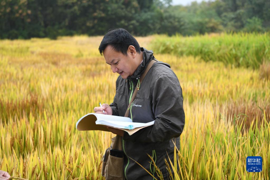 10月27日,在中科院合肥研究院智能所離子束生物工程與綠色農業研究中心的育種基地里,研究員劉斌美觀察用于科研的水稻表型。