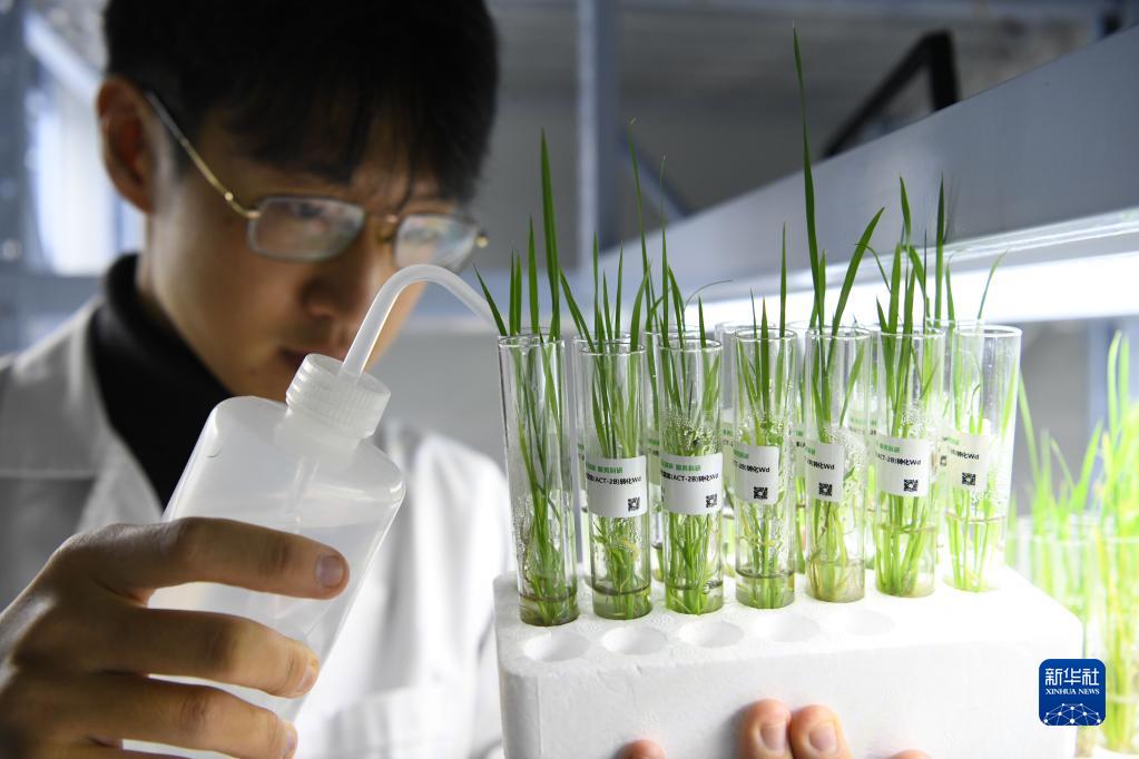 10月27日,在中科院合肥研究院智能所離子束生物工程與綠色農業研究中心,博士生姜鴻瑞給培育中的水稻加水。