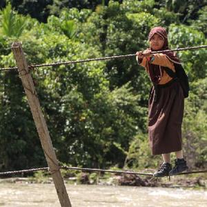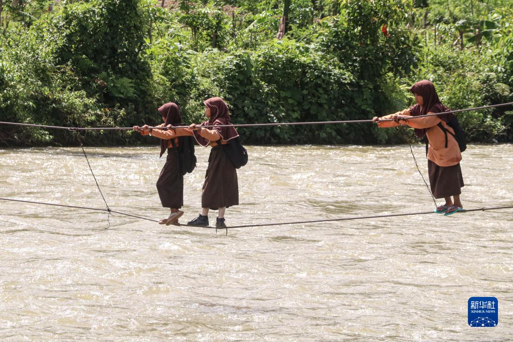 在印度尼西亞西亞齊地區,部分村落的孩子們需要通過鋼索橫跨河流上學。