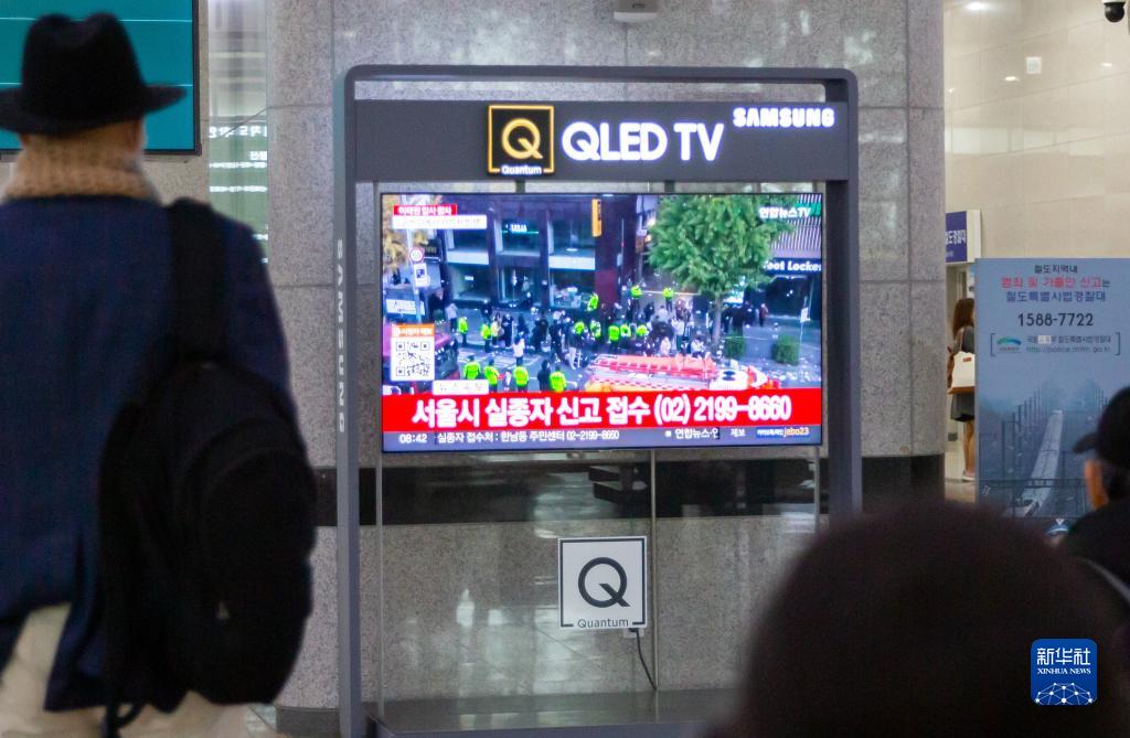 10月30日,在韓國慶尚北道慶州,人們關注車站電視播放的踩踏事故相關報道。