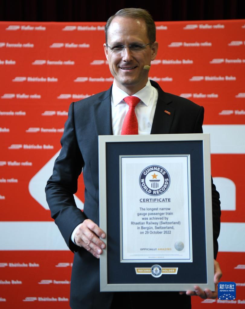 10月29日,在瑞士貝爾金,瑞士雷蒂亞鐵路公司主管雷納托·法夏蒂展示吉尼斯世界紀錄證書。