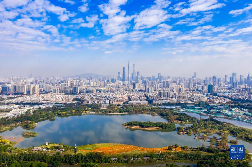 這是2020年2月24日拍攝的廣州海珠濕地海珠湖(無人機照片)。