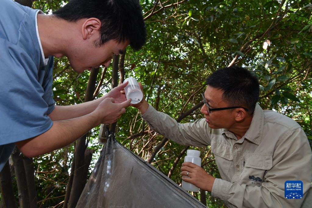 科研人員在廣州海珠濕地查看馬氏網采集到的昆蟲樣本(2021年10月25日攝)。