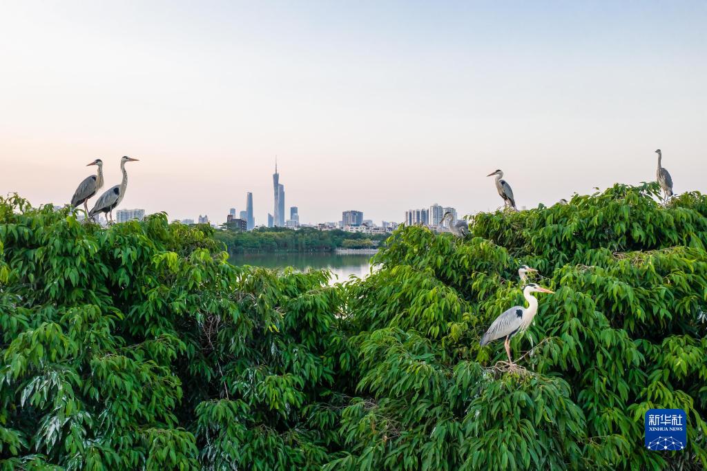廣州海珠濕地海珠湖鳥島上的蒼鷺(2020年4月27日攝,無人機照片)。