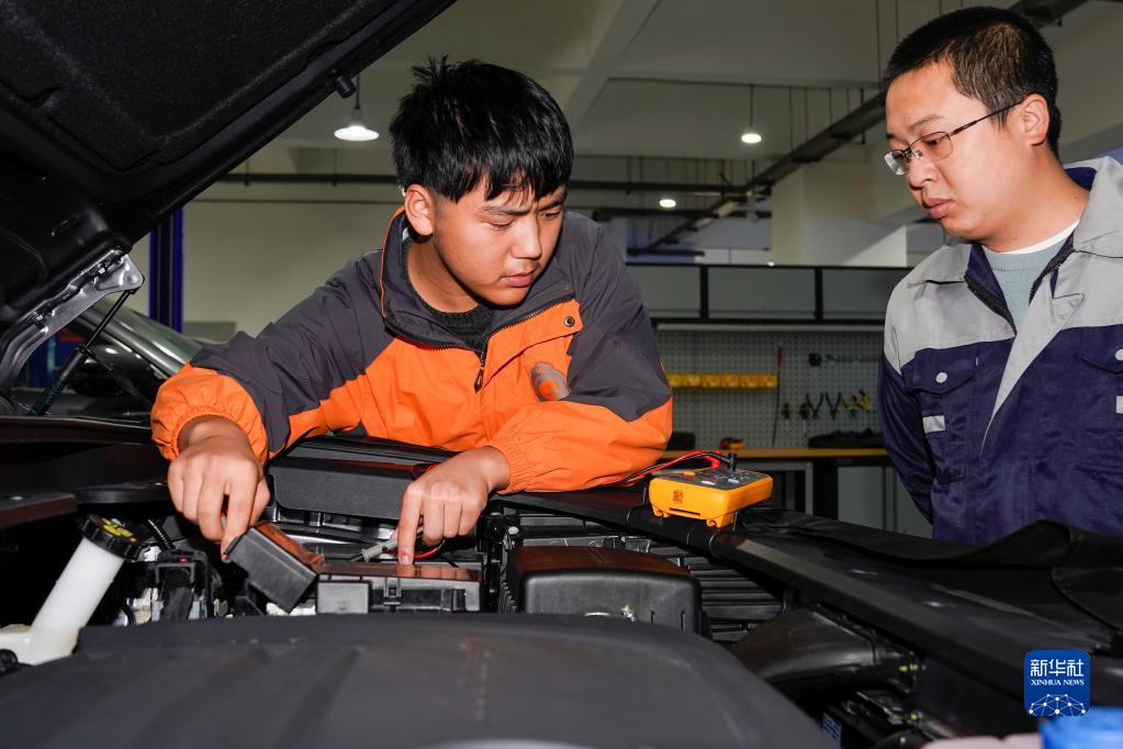 10月27日,重慶市黔江區民族職業教育中心的學生在老師(右)的指導下進行汽車故障檢查。