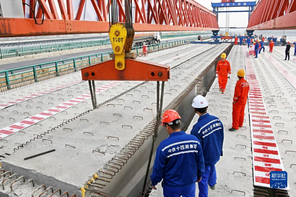 10月30日,青蘭高速公路雙埠至河套段女姑口特大橋施工現場,中鐵十四局建設者在吊放最后一片50米T梁。