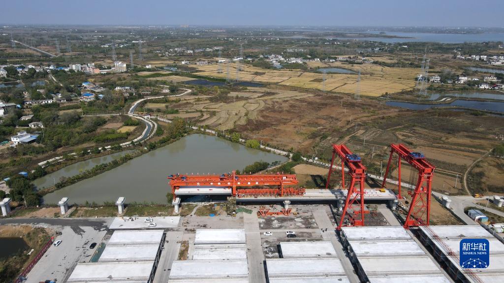 這是中鐵四局合新鐵路安徽段站前七標箱梁架設現場(10月30日攝,無人機照片)。