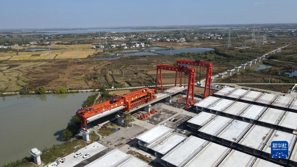 這是中鐵四局合新鐵路安徽段站前七標箱梁架設現場(10月30日攝,無人機照片)。