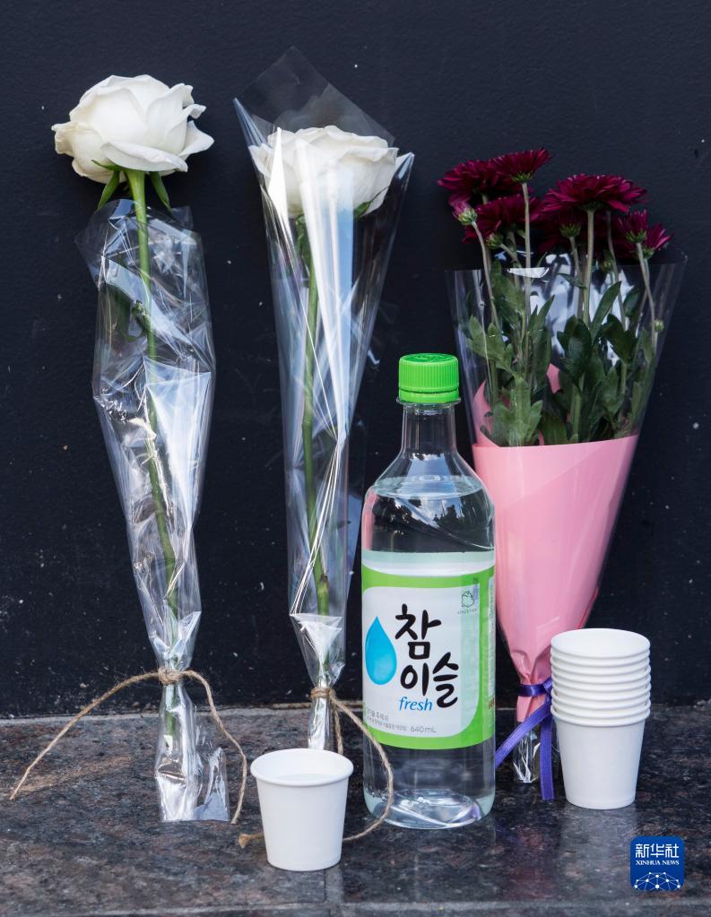 這是10月30日在韓國首爾踩踏事故現場附近拍攝的悼念遇難者的鮮花和酒。