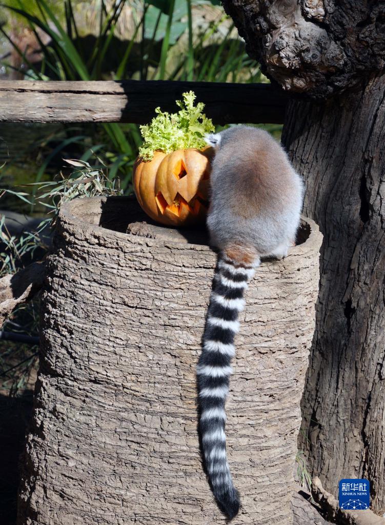 10月30日,在意大利羅馬動物園,環尾狐猴享用節日南瓜。