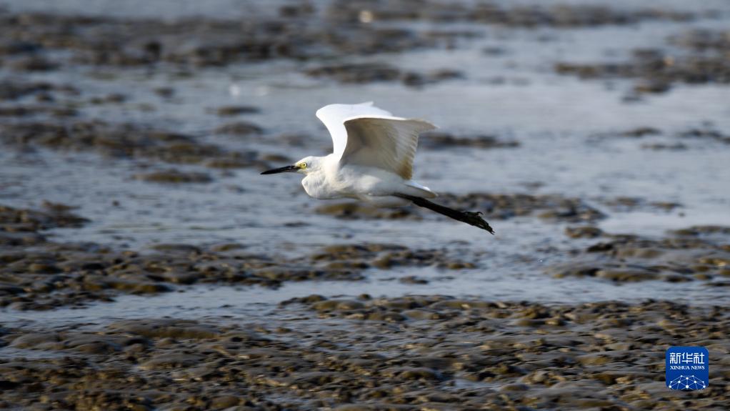 一只鳥在廣西山口紅樹林生態國家級自然保護區飛行(10月23日攝)。