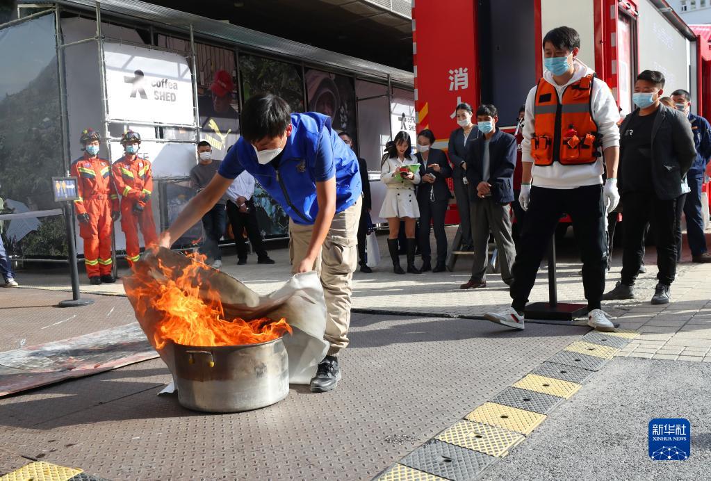 10月31日,一名社區消防志愿者(前)在體驗使用滅火毯滅火。