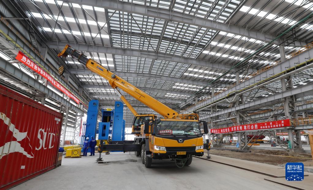 中船長興造船基地二期工程船體聯合車間內首臺大型設備主體結構吊裝現場(10月31日攝)。