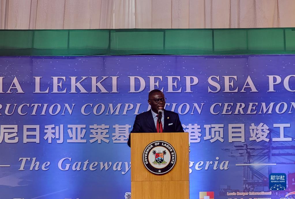 10月31日,在尼日利亞拉各斯,拉各斯州州長巴巴吉德·桑沃-奧盧在中企承建的尼日利亞萊基深水港竣工儀式上致辭。