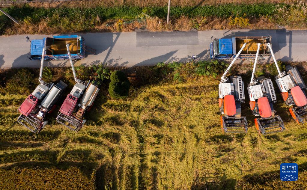 近期,浙江省湖州市吳興區東林鎮的數千畝晚稻進入收割期。當地運用數字化系統統一調度收割機、運輸車、烘干機等農業機械,完成秋糧收割、烘干、打包、裝車全過程。