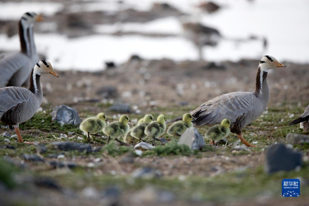 幾只斑頭雁在青海湖鳥島濕地活動(2020年6月2日攝)。