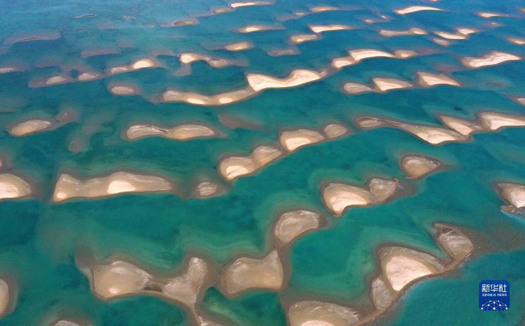 這是青海湖鳥島濕地一景(2020年7月10日攝,無人機照片)。