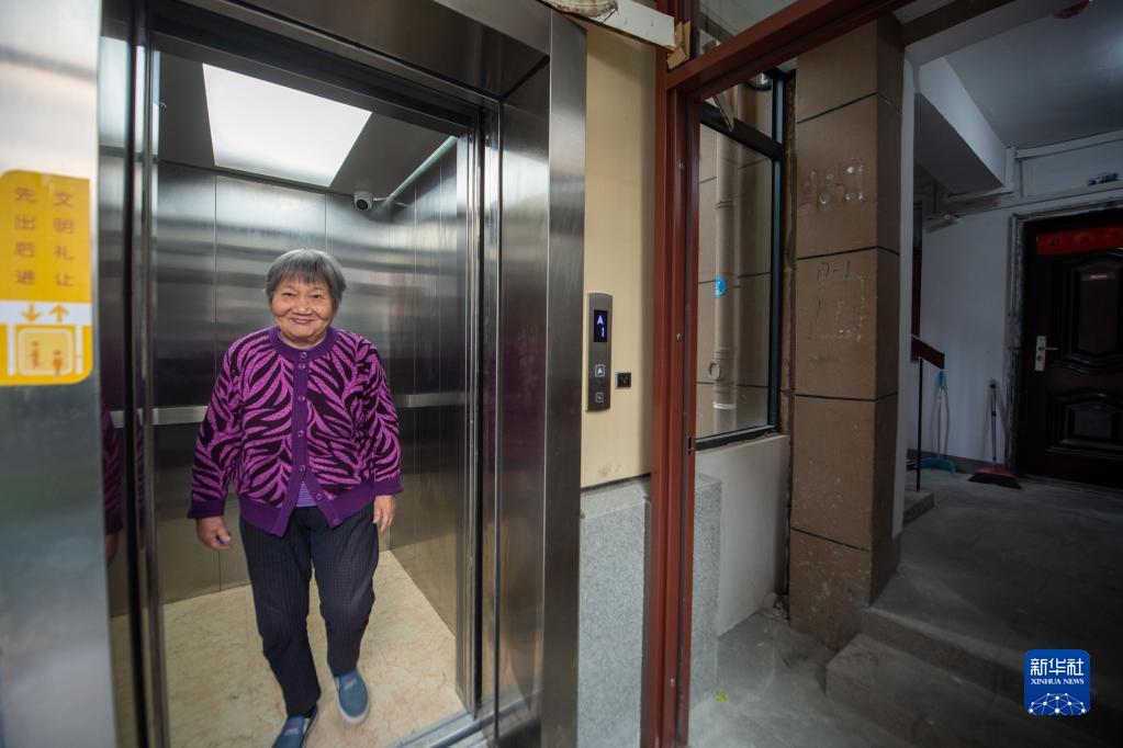 11月1日,松木場社區一名老年居民乘坐電梯。