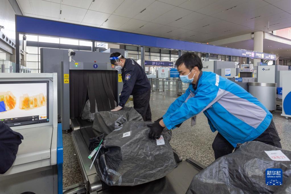 11月1日,在上海虹橋站內貨物專用安檢口,鐵路工作人員搬運通過安檢的貨物。