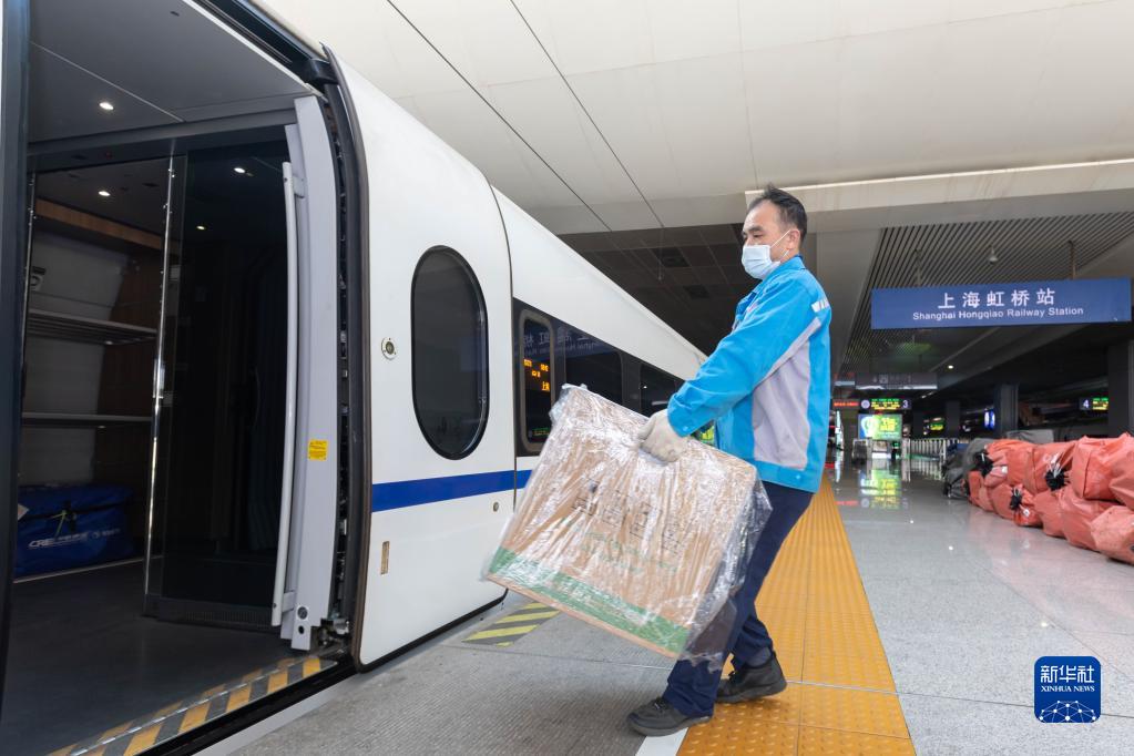 11月1日,在上海虹橋站,鐵路工作人員將貨物搬到G1373次列車上。